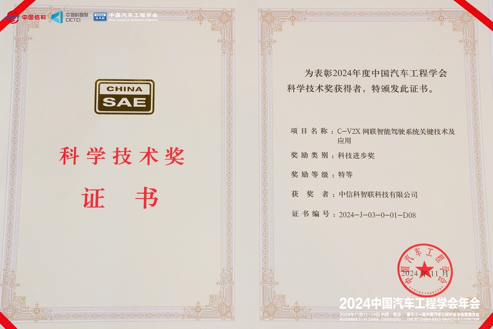 為表彰在推動行業(yè)科技進(jìn)步中做出杰出貢獻(xiàn)的單位和個人,中國汽車工程學(xué)會同期特別舉辦了首屆中國汽車工程學(xué)會科學(xué)技術(shù)獎勵大會暨高等級獎項(xiàng)技術(shù)分享會。由中國信科集團(tuán)、中信科智聯(lián)、中汽中心、中國一汽、蔚來汽車、東風(fēng)悅享、北京車網(wǎng)、國汽(北京)智聯(lián)等單位聯(lián)合申報的“C-V2X 網(wǎng)聯(lián)智能駕駛系統(tǒng)關(guān)鍵技術(shù)及應(yīng)用”榮獲2024年度中國汽車工程學(xué)會科學(xué)技術(shù)獎-特等獎,彰顯以上科研團(tuán)隊(duì)為智能網(wǎng)聯(lián)車產(chǎn)業(yè)發(fā)展作出的突出貢獻(xiàn)。此獎不僅是對獲獎?wù)叩臉s譽(yù)認(rèn)可,更是對整個行業(yè)創(chuàng)新精神的一次集中展示,激勵著更多科研人員和團(tuán)隊(duì)為汽車科技的進(jìn)步貢獻(xiàn)力量。