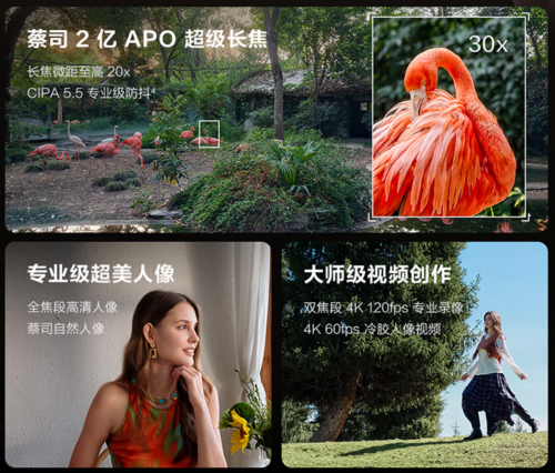 vivo X300 Pro后置蔡司2億APO超級長焦、蔡司云臺級主攝、蔡司超視野超廣角攝像頭,配置藍圖自研影像雙芯VS1 & V3+;蔡司2億APO超級長焦擁有CIPA 5.5專業(yè)級防抖,更清晰;舞臺模式下還支持4K級錄中美拍,同時獲得照片與視頻,支持4K雙視野錄像;支持高達480mm+超遠距運動抓拍,單拍連拍成片都清晰;支持4K 120fps 10bit Log視頻,原始光影信息記錄更充分,給后期更廣闊發(fā)揮空間,還支持4K 120fps 杜比視界HDR、4K 60fps 冷膠人像視頻。消費者還可選擇vivo X300 Pro攝影師套裝,搞定多場景拍攝;可搭配2.35x長焦增距鏡、專業(yè)影像手柄。