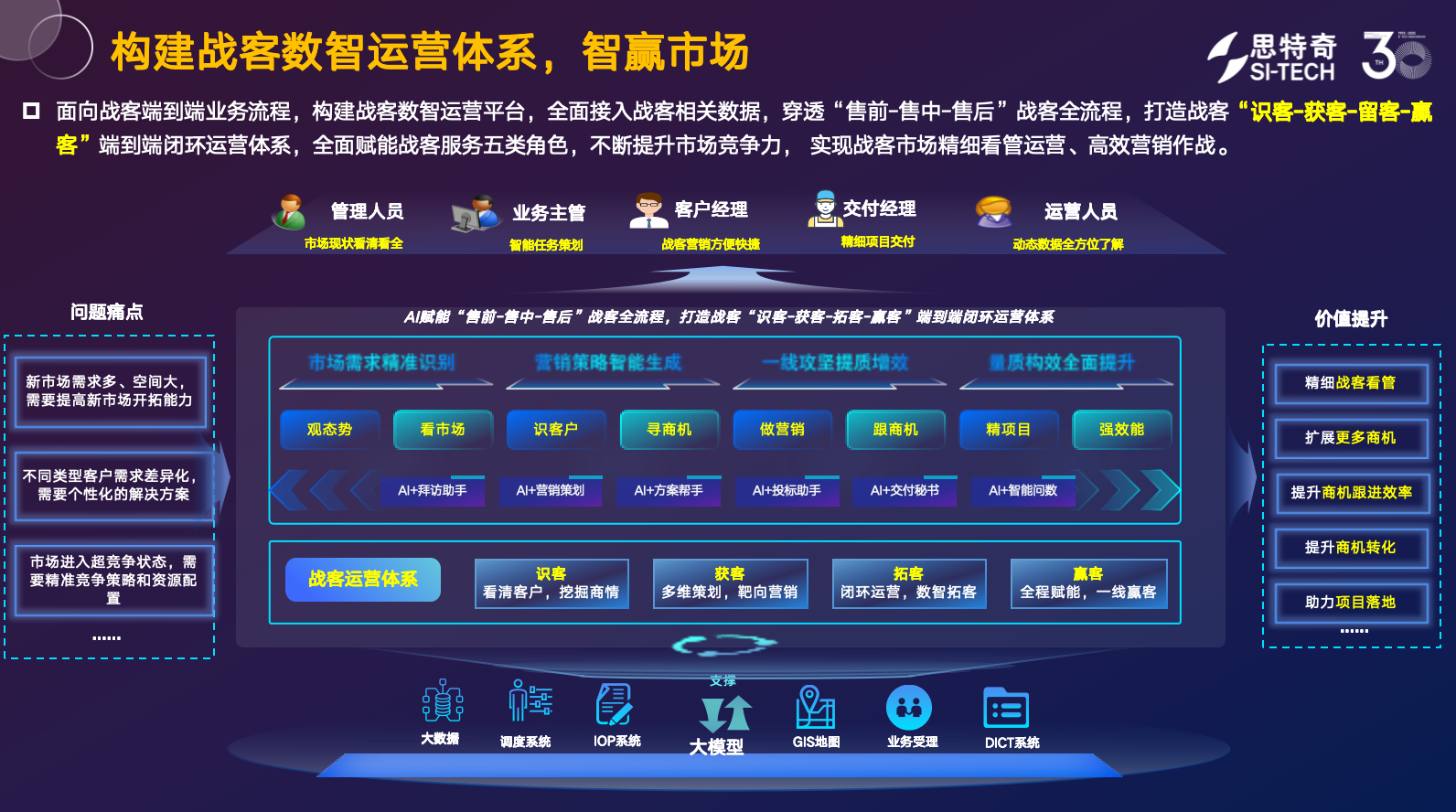 此次大會(huì)期間,思特奇展出的“市場(chǎng)全息作戰(zhàn)”與“政企智慧運(yùn)營(yíng)”兩大方案,形成了覆蓋國(guó)內(nèi)大眾市場(chǎng)、國(guó)內(nèi)政企戰(zhàn)客、國(guó)際全域業(yè)務(wù)的全域賦能矩陣,并對(duì)行業(yè)轉(zhuǎn)型瓶頸做出突破性破解:首先,跳出傳統(tǒng)業(yè)務(wù)支撐“工具化”的局限,以全鏈路數(shù)智能力深度參與運(yùn)營(yíng)商戰(zhàn)略落地,升級(jí)為“戰(zhàn)略賦能”角色;其次,突破單一場(chǎng)景優(yōu)化的壁壘,拉通大眾市場(chǎng)與政企市場(chǎng)、國(guó)內(nèi)業(yè)務(wù)與國(guó)際業(yè)務(wù)的跨域協(xié)同,讓運(yùn)營(yíng)效能形成聚合效應(yīng);另外,突破地域運(yùn)營(yíng)邊界,通過(guò)全球化運(yùn)營(yíng)能力構(gòu)建,助力運(yùn)營(yíng)商在國(guó)際市場(chǎng)搶占先機(jī),形成全域增長(zhǎng)格局。