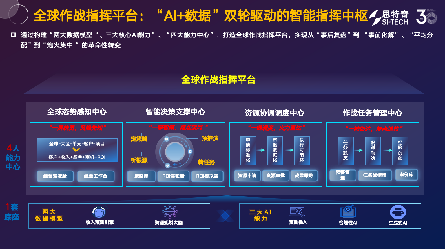 面向全球化布局需求,"政企智慧運(yùn)營(yíng)"方案升級(jí)打造"感知-決策-執(zhí)行-反饋"端到端全球作戰(zhàn)指揮體系,以收入預(yù)測(cè)引擎和資源規(guī)劃引擎為兩大核心抓手,構(gòu)建全球化運(yùn)營(yíng)核心能力: