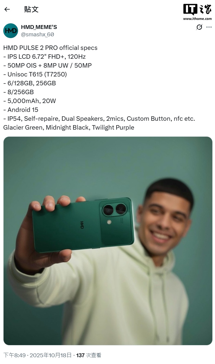 10 月 18 日消息,消息人士 @smashx_60 今日在 X 平臺(tái)發(fā)文,曝光 HMD Pulse 2 Pro 手機(jī)的詳細(xì)規(guī)格。
