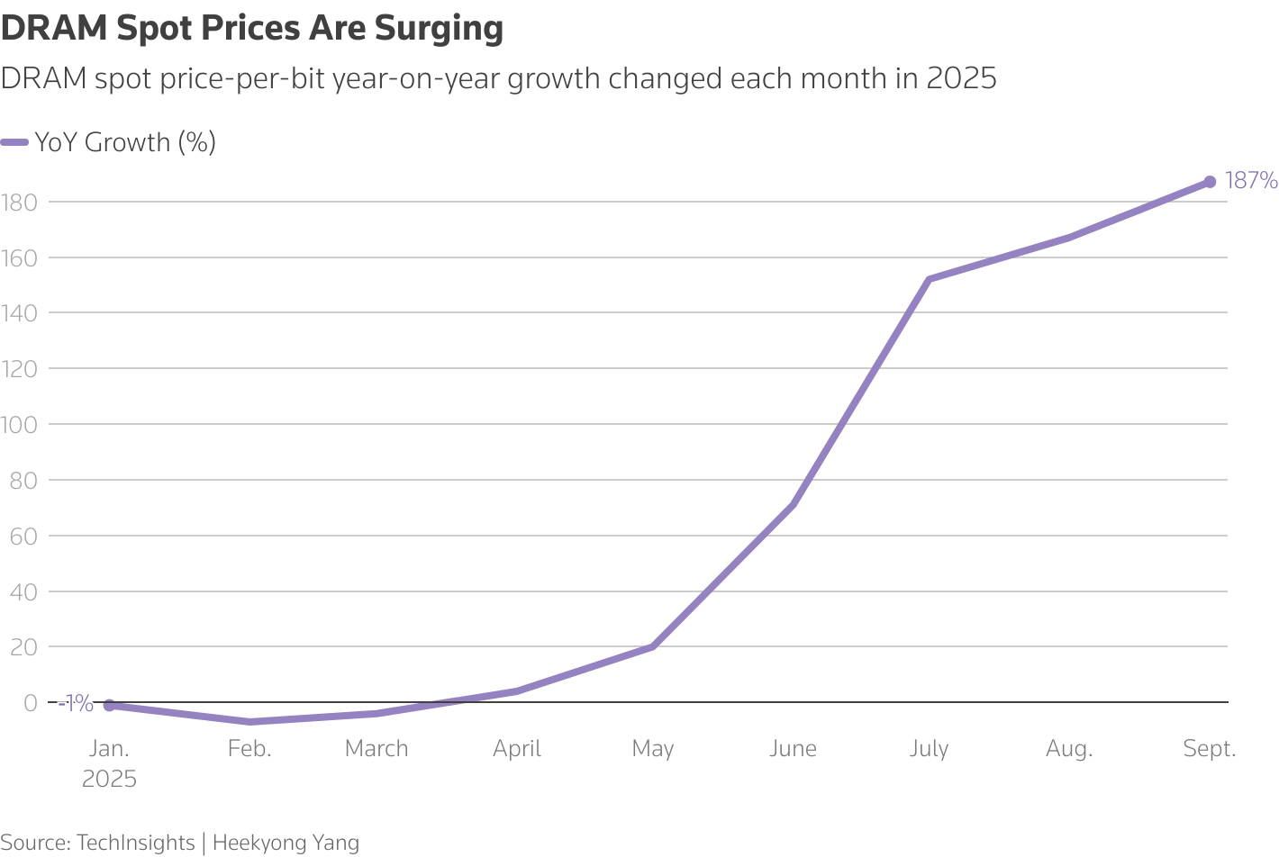 2025年DRAM現(xiàn)貨價格每比特同比增長率變化圖