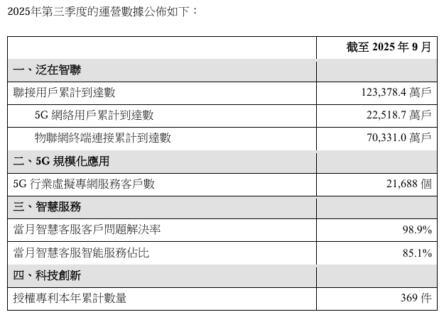 數(shù)據(jù)顯示,2025年第三季度,中國聯(lián)通聯(lián)接用戶總數(shù)達(dá)到12.33784億戶,物聯(lián)網(wǎng)終端連接累計(jì)達(dá)7.0331億戶,5G行業(yè)虛擬專網(wǎng)服務(wù)客戶數(shù)達(dá)21688個(gè),當(dāng)月智慧客服客戶問題解決率達(dá)98.9%,當(dāng)月智慧客服智能服務(wù)占比達(dá)85.1%,授權(quán)專利本年累計(jì)數(shù)量達(dá)369件。