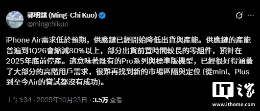 郭明錤:蘋果 iPhone Air 需求不及預期,供應鏈產(chǎn)能將縮減超 80%