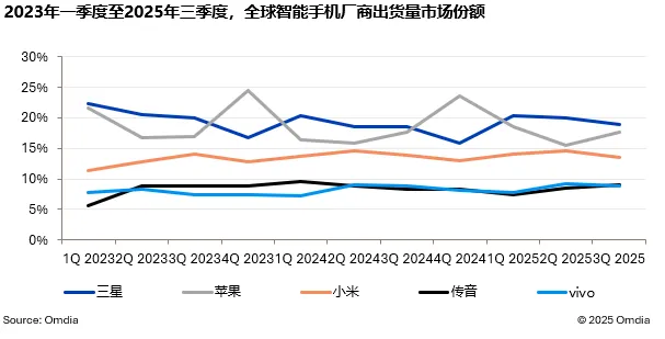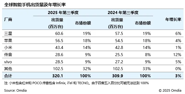 Omdia 報告 2025Q3 全球手機出貨量:三星同比增 6%、蘋果增 4%、小米增 1%、傳音增 12%、vivo 增 5%