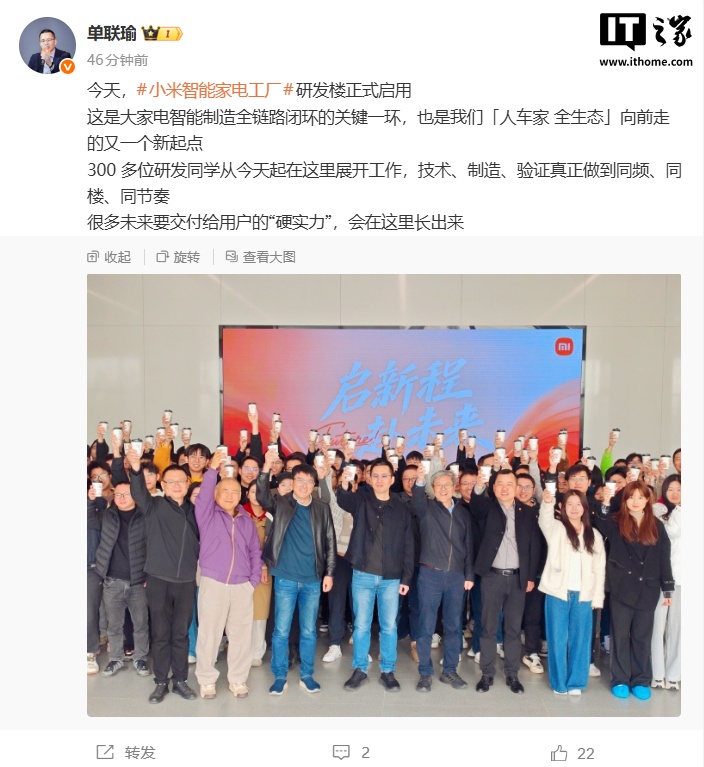 11 月 27 日消息,小米集團大家電部總經(jīng)理單聯(lián)瑜在微博發(fā)文稱,今天小米智能家電工廠研發(fā)樓正式啟用。