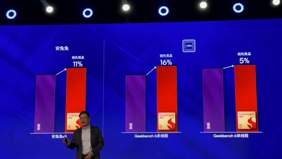 另外,與競品相比,第五代驍龍8安兔兔分?jǐn)?shù)領(lǐng)先11%,Geekbench 6多線程分?jǐn)?shù)領(lǐng)先16%,單線程分?jǐn)?shù)也領(lǐng)先競品5%。在CPU多線程能效的部分,第五代驍龍8和競品相比,達(dá)到相同峰值性能的情況下,功耗領(lǐng)先36%;而在功耗相同的情況下,性能領(lǐng)先12%。