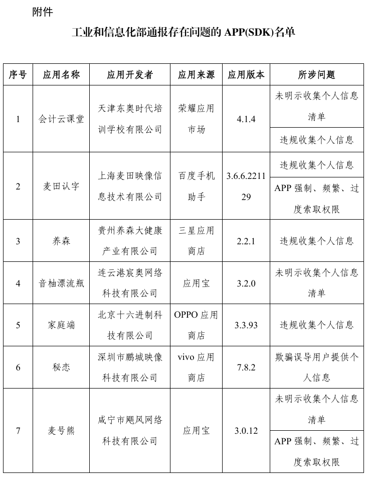 附件:工業(yè)和信息化部通報存在問題的APP(SDK)名單