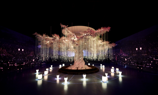 其中的一大亮點(diǎn)為第八展區(qū)“神檀樹(shù)”,12臺(tái)科視Christie M 4K25 RGB純激光投影機(jī)以高位布局方式將絢麗影像投射至圍繞巨型樹(shù)狀結(jié)構(gòu)的墻面。隨著季節(jié)光影在環(huán)境中變幻,富有節(jié)奏的鼓聲在整個(gè)空間回蕩,觀眾仿佛沉浸在一個(gè)自然、神話與新羅宇宙律動(dòng)交織的生動(dòng)儀式之中。