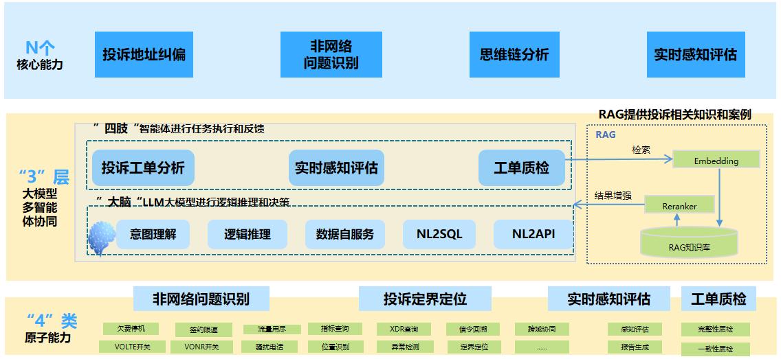 數(shù)字員工聚焦全流程優(yōu)化,融合四大智能化能力:智能地址糾偏,可實(shí)時(shí)回填用戶(hù)六級(jí)地址,提升派單準(zhǔn)確率與處理效率;非網(wǎng)絡(luò)問(wèn)題自動(dòng)識(shí)別,精準(zhǔn)判斷終端開(kāi)關(guān)機(jī)、欠費(fèi)、簽約異常等問(wèn)題,向前賦能客服,提升前端自解決能力;基于思維鏈的網(wǎng)絡(luò)問(wèn)題分析,依托通信大模型,實(shí)現(xiàn)對(duì)投訴內(nèi)容的理解與推理;實(shí)時(shí)感知后評(píng)估,閉環(huán)驗(yàn)證處理效果,持續(xù)優(yōu)化策略。