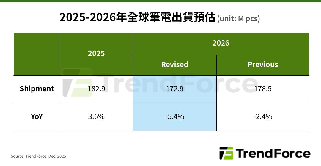 TrendForce 再度下調 2026 年全球筆記本電腦出貨預測至同比減少 5.4%