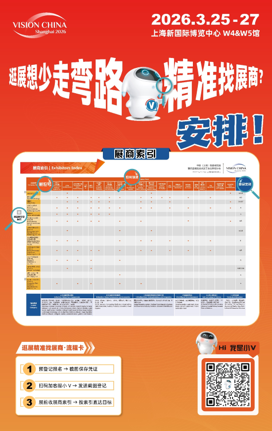 小V準(zhǔn)備了超實(shí)用的展商索引——清晰標(biāo)注各展商應(yīng)用領(lǐng)域與展品類別。讓您省去篩選麻煩,直奔目標(biāo)展臺(tái),F(xiàn)在完成預(yù)登記報(bào)名并添加客服小V,展前免費(fèi)發(fā)放這份實(shí)用指引,提前規(guī)劃行程、鎖定核心資源。早登記早省心,趕緊行動(dòng),解鎖這場(chǎng)機(jī)器視覺行業(yè)盛宴!