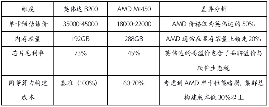 根據(jù)2025年英偉達(dá)與AMD公布的財(cái)報(bào),構(gòu)建簡(jiǎn)易模型對(duì)比英偉達(dá)(以B200對(duì)應(yīng)世代產(chǎn)品為例)與AMD(以MI450為例)的單卡成本結(jié)構(gòu)。