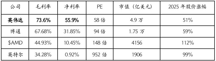 (注:英偉達(dá)是2026財(cái)年三季度數(shù)據(jù),AMD是2025財(cái)年上半年數(shù)據(jù),博通與英特爾是2025財(cái)年前三季度數(shù)據(jù),來(lái)源:富途)