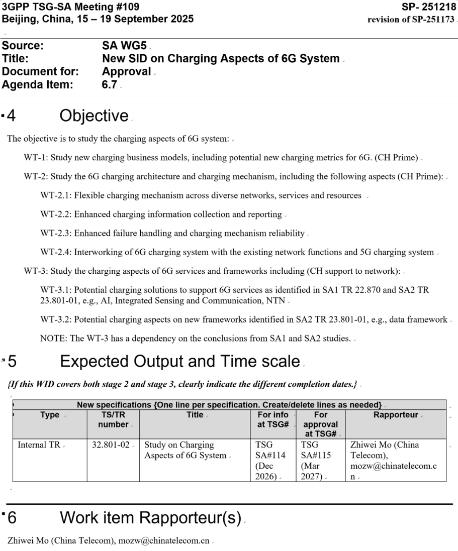 據(jù)介紹,在 9 月 16 日至 19 日于北京召開(kāi)的 3GPP 業(yè)務(wù)與系統(tǒng)技術(shù)規(guī)范組(TSG SA)第 109 次全會(huì)上,由中國(guó)電信研究院牽頭的“6G 系統(tǒng)計(jì)費(fèi)研究”項(xiàng)目正式獲批通過(guò),實(shí)現(xiàn)中國(guó)電信在 3GPP 國(guó)際標(biāo)準(zhǔn)組織的 6G 牽頭立項(xiàng)突破。該項(xiàng)目是 3GPP SA5 工作組首個(gè)獲批的 6G 項(xiàng)目。