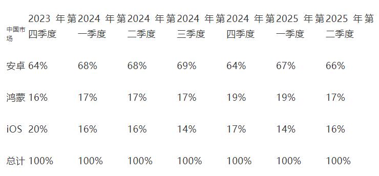 附上 2023 年第 4 季度到 2025 年第 2 季度中國手機(jī)系統(tǒng)分布圖表如下: