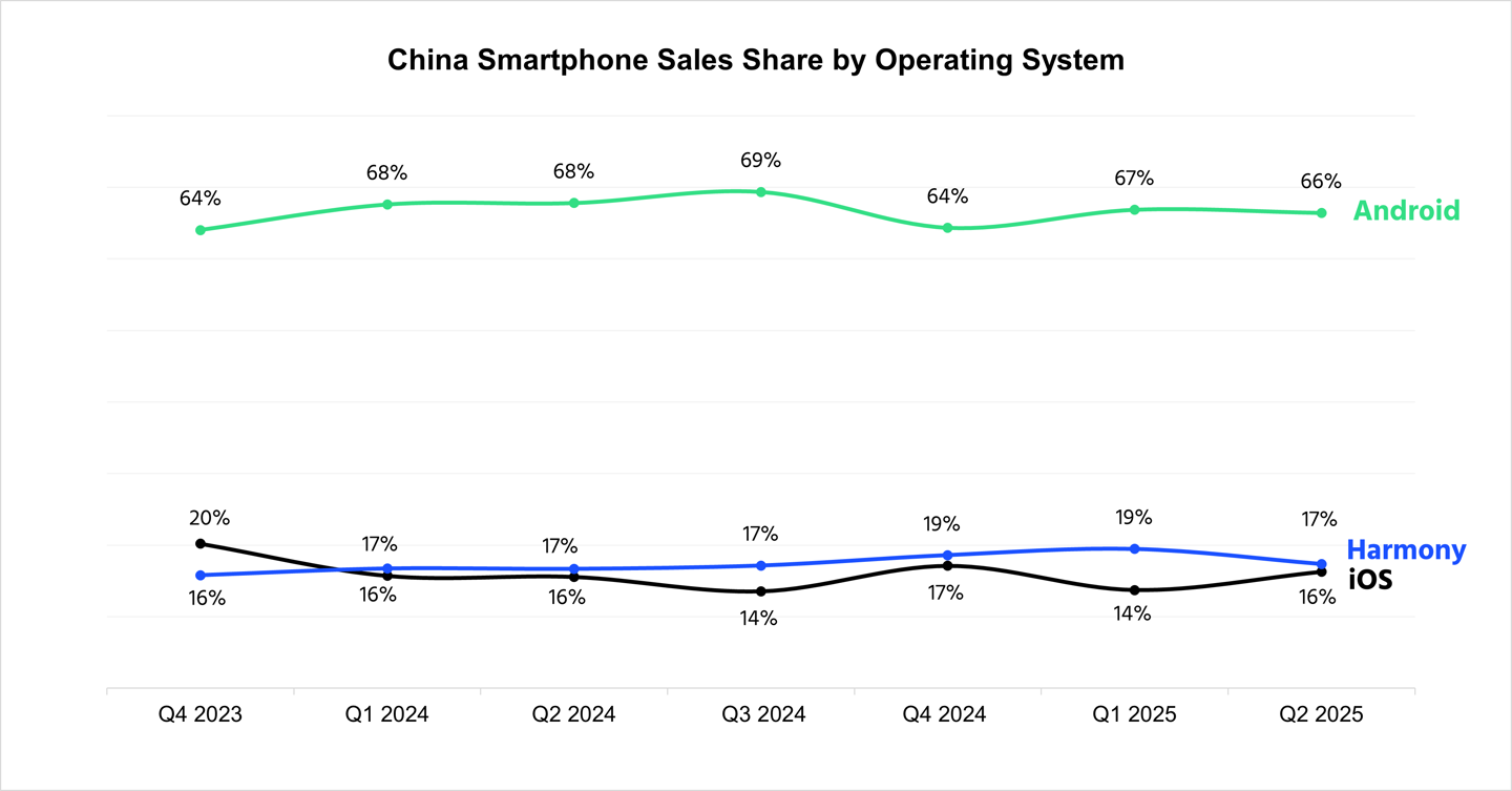 CounterPoint 報告中國手機(jī)系統(tǒng)份額:華為鴻蒙連續(xù) 6 個季度超蘋果 iOS 穩(wěn)居第二