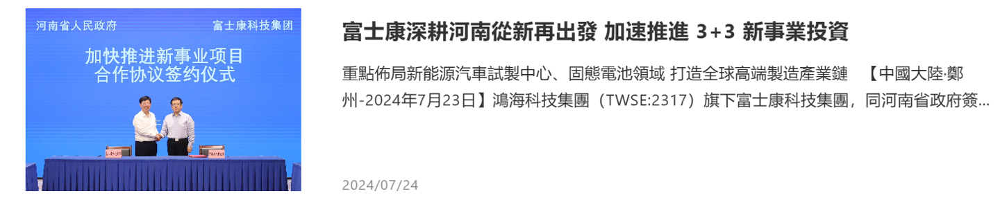 2024 年 7 月 23 日,鴻海子公司富士康科技集團同河南省政府簽署《河南省政府與富士康科技集團加快推進新事業(yè)項目戰(zhàn)略合作協(xié)議》。