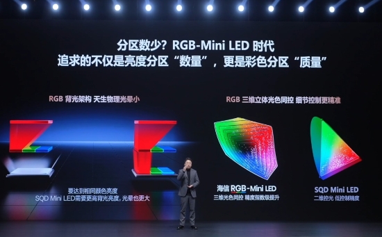 近年來,高端電視市場陷入單純堆砌分區(qū)數(shù)量的內(nèi)卷誤區(qū),一些廠商執(zhí)著于分區(qū)數(shù)比拼,卻忽視了光源、控光等顯示技術(shù)的本質(zhì)迭代。當(dāng)前無論是QD-Mini LED還是SQD-Mini LED技術(shù),本質(zhì)都是單色背光+量子點Mini LED方案,依賴藍(lán)光+量子點膜完成色彩轉(zhuǎn)換,光線需經(jīng)過量子點膜、濾光片等多重介質(zhì),不僅光能量損耗多造成功耗較RGB-Mini LED高出50%,同時高亮場景下更易出現(xiàn)色彩沖淡、畫面泛白等問題,直接影響視覺體驗。