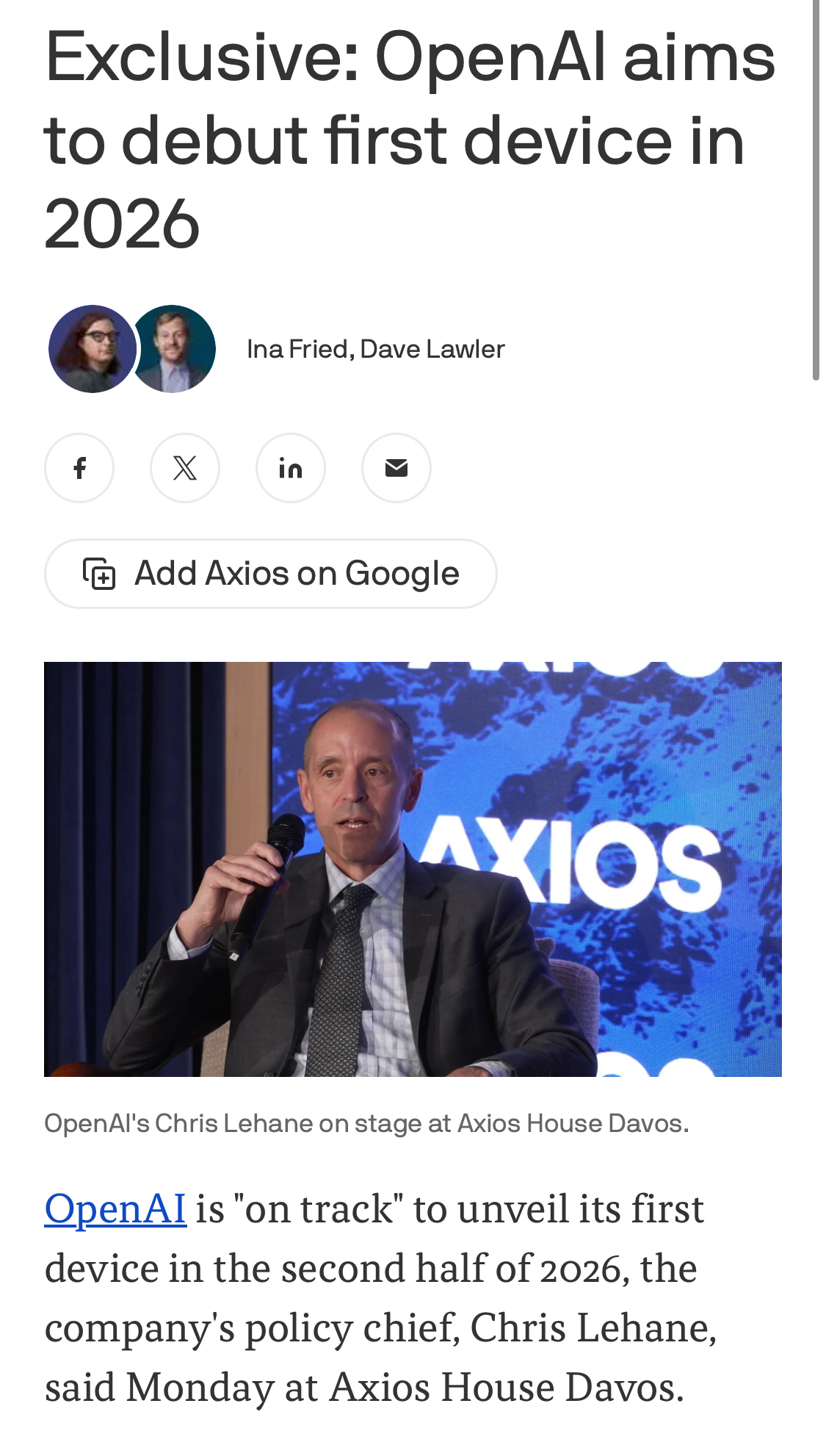 據(jù) Axios 網(wǎng)站報(bào)道,OpenAI 政策主管克里斯 · 萊恩周一在達(dá)沃斯論壇透露,公司“正按計(jì)劃”于 2026 年下半年推出其首款設(shè)備。