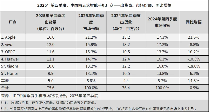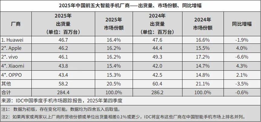 IDC:華為重返 2025 年中國(guó)智能手機(jī)市場(chǎng)出貨榜首,蘋果 iPhone 17 系列創(chuàng) Q4 單季新高、小米連續(xù)兩年實(shí)現(xiàn)增長(zhǎng)
