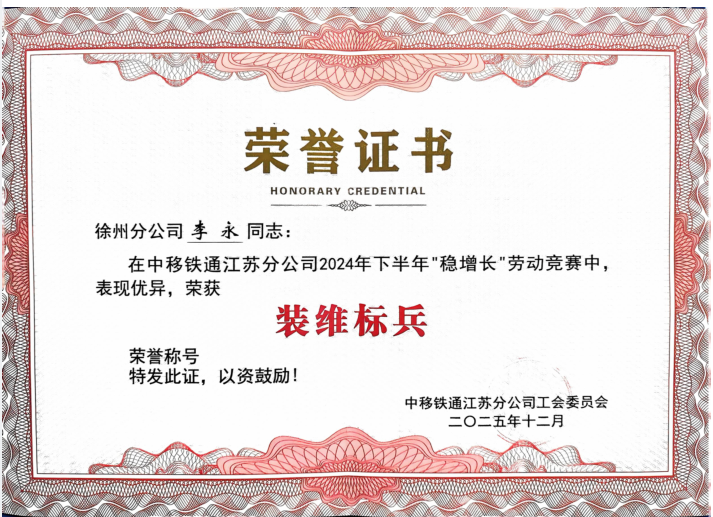 近日,從省分公司傳來捷報:在江蘇鐵通2024年下半年“穩(wěn)增長”勞動競賽中,徐州分公司員工李永、戚建分別榮獲“裝維標兵”“工程先鋒”稱號。他們以卓越表現(xiàn)切實踐行了“淬鐵復(fù)興、創(chuàng)新向上”的企業(yè)精神,充分彰顯了“有旗必奪、有先必爭”的奮斗風貌。讓我們以他們?yōu)榘駱,見賢思齊、接續(xù)奮斗!