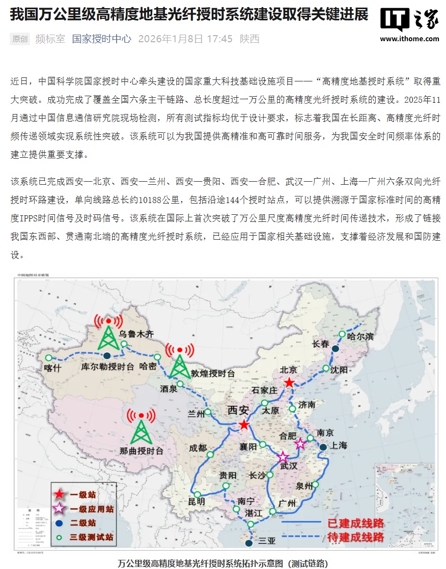 1 月 8 日消息,中國科學(xué)院國家授時(shí)中心今日官宣,國家重大科技基礎(chǔ)設(shè)施項(xiàng)目 ——“高精度地基授時(shí)系統(tǒng)”取得重大突破,成功完成了覆蓋全國六條主干鏈路、總長度超過一萬公里的高精度光纖授時(shí)系統(tǒng)的建設(shè)。