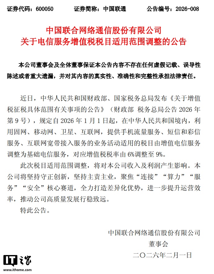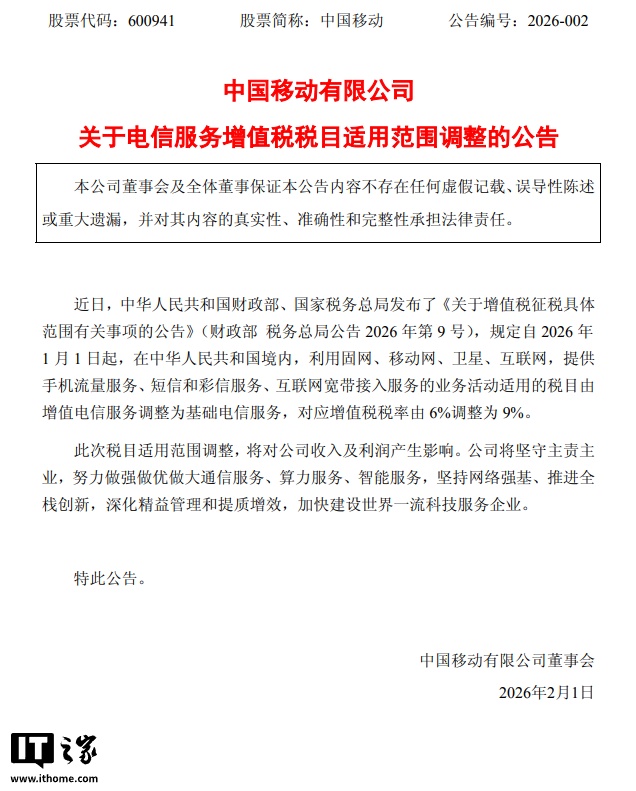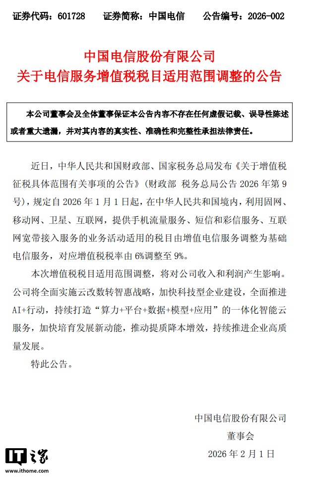 2 月 1 日消息,中國(guó)電信、中國(guó)聯(lián)通、中國(guó)移動(dòng)三大運(yùn)營(yíng)商今日發(fā)布公告,宣布將電信服務(wù)增值稅稅目適用范圍調(diào)整稅率由 6% 調(diào)整為 9%。IT之家附原文如下: