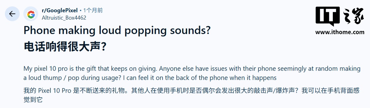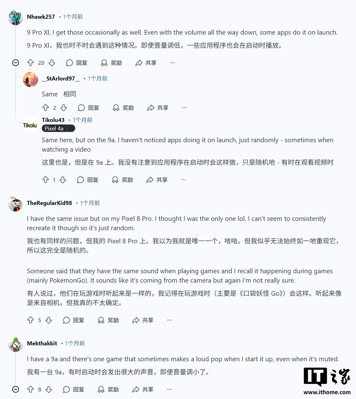 根據(jù)多名用戶在 Reddit 社區(qū)發(fā)文,這些爆音是隨機出現(xiàn)的,而且音量飄忽不定,有時候可能會相當響,隨后有許多用戶在評論區(qū)表示,自己的 Pixel 10 Pro、Pixel 9、Pixel 8 和 Pixel 7 都遇到了類似問題,表明這種故障并非局限于某一款機型。
