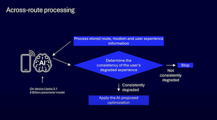 在隨后的行程中,通過(guò)高通在端側(cè)運(yùn)行的Llama 3.1模型,AI智能體將類似的視頻凍結(jié)事件記錄到其“情節(jié)記憶”中,識(shí)別出這是一種在特定位置發(fā)生的固定現(xiàn)象,而非偶然的網(wǎng)絡(luò)波動(dòng)。通過(guò)數(shù)據(jù)推理,AI智能體發(fā)現(xiàn)視頻凍結(jié)的原因是設(shè)備在4G與5G網(wǎng)絡(luò)之間的頻繁切換。于是,AI智能體提出建議,當(dāng)設(shè)備處于該地下停車場(chǎng)位置時(shí),應(yīng)保持在5G網(wǎng)絡(luò)而不切換到4G。在之后的行程中,應(yīng)用該優(yōu)化方案后,視頻通話不再出現(xiàn)凍結(jié)現(xiàn)象。