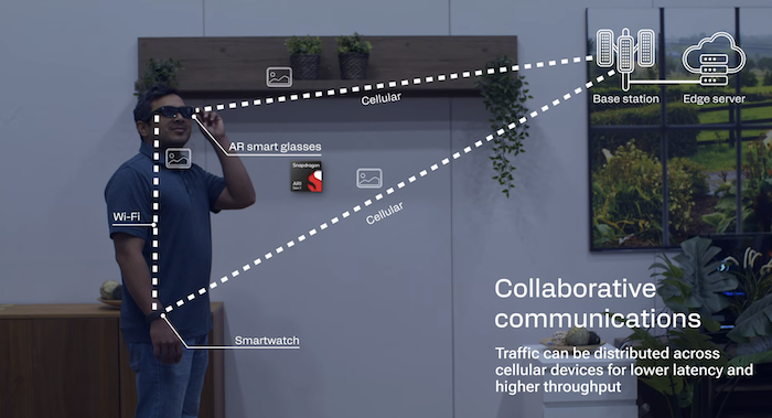 這項(xiàng)能力目前最大的受益者可能是AR眼鏡,由于此類設(shè)備本身體積較小、電池容量有限,難以獨(dú)自承擔(dān)所有的數(shù)據(jù)傳輸任務(wù),而通過(guò)Wi-Fi與智能手機(jī)連接,可將部分?jǐn)?shù)據(jù)流量經(jīng)由手表的蜂窩連接傳送至基站。同理,通過(guò)AR眼鏡與手機(jī)的配合,同樣可以帶來(lái)更加高帶寬、低延遲的聯(lián)網(wǎng)體驗(yàn)。