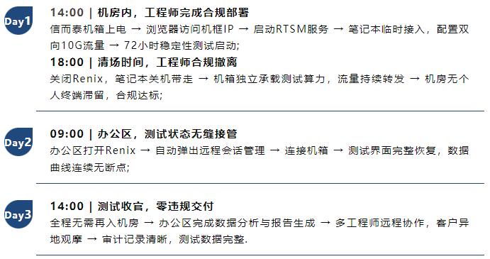 RTSM價值:白天配置啟動,夜間機箱自主運行,次日遠程驗收,合規(guī)前提下完成72小時壓力驗證。