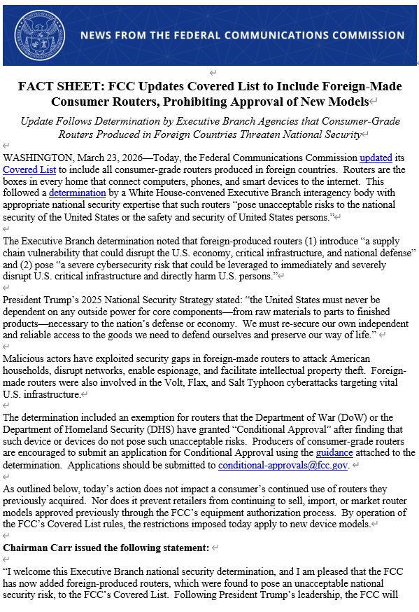 美國(guó) FCC 宣布禁止進(jìn)口所有外國(guó)制造的新款消費(fèi)級(jí)路由器,現(xiàn)有型號(hào)不受影響