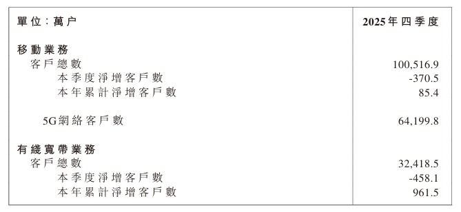 數(shù)據(jù)顯示,2025年第四季度,中國移動(dòng)用戶總數(shù)達(dá)到10.05169億戶,第四季度用戶數(shù)較少370.5萬戶;5G網(wǎng)絡(luò)用戶數(shù)達(dá)6.41998億戶,本季度凈增1964.5萬戶。有線寬帶方面,中國移動(dòng)有線寬帶用戶總數(shù)達(dá)到 3.24185億戶,本季度減少458.1萬戶。
