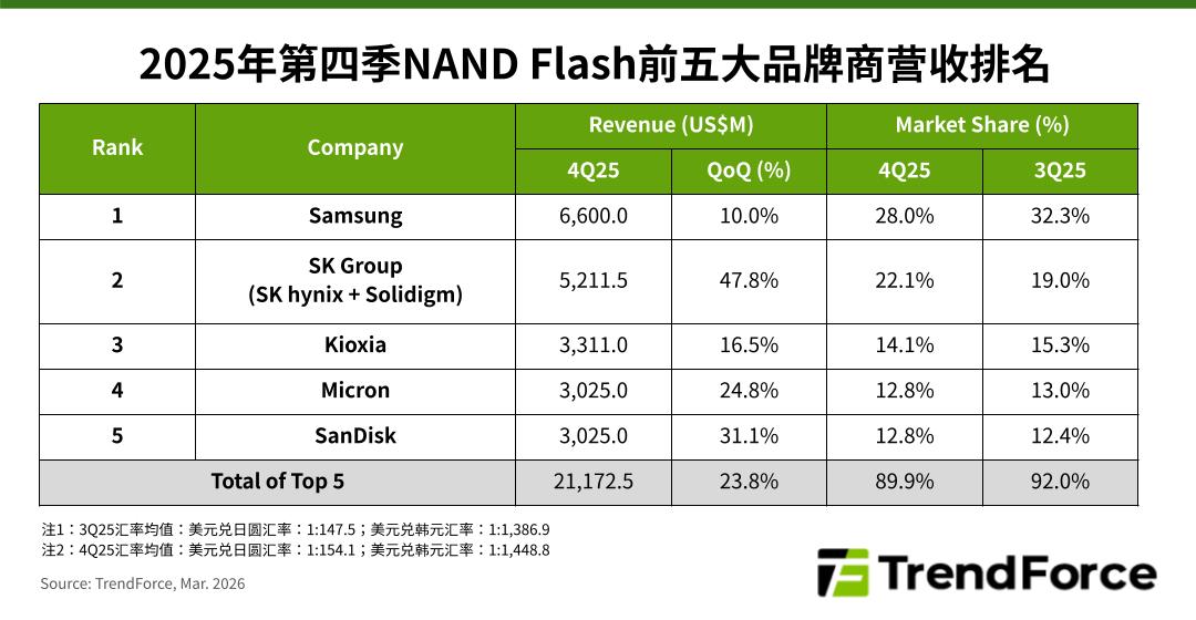 TrendForce:2025Q4 五大 NAND 閃存原廠相關營收環(huán)比增長 23.8%