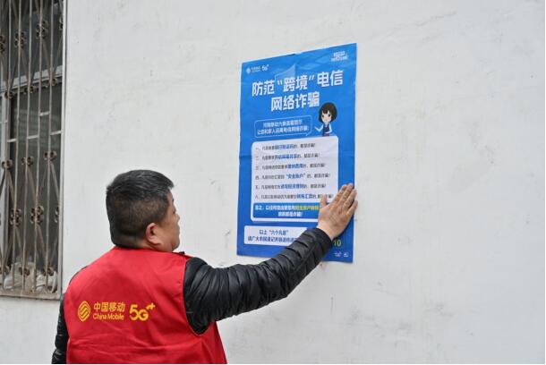 陳鋒下鄉(xiāng)粘貼反詐海報(bào),為寨根鄉(xiāng)桑樹村村民講解反詐