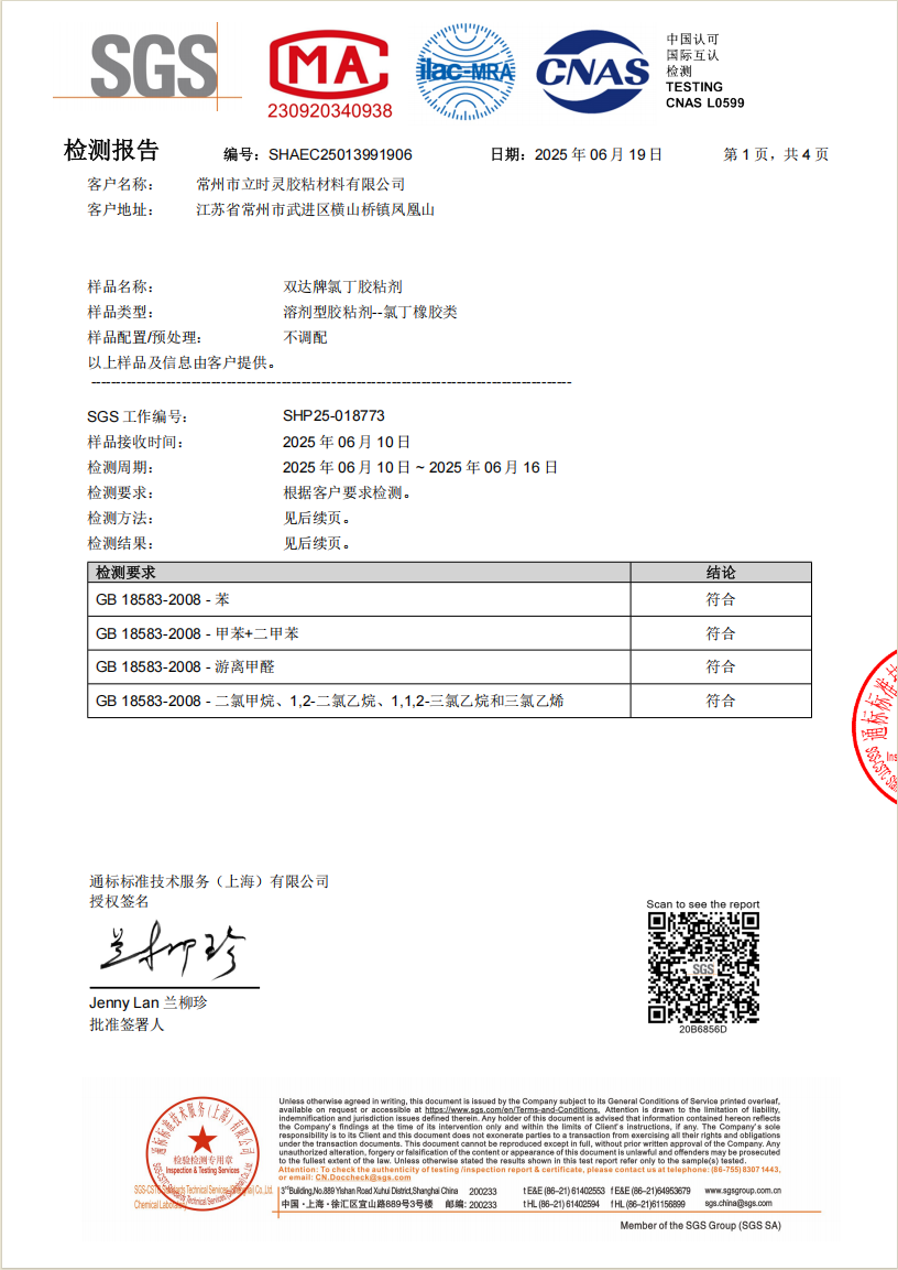 在環(huán)保膠水領域,有這樣一家廠家:深耕行業(yè)近40年,從1986年創(chuàng)辦至今,始終堅持“用好料、制好膠”的理念。雙達化工是江蘇省高新技術企業(yè),江蘇省專精特新中小企業(yè),江蘇省高知名品牌,是國家膠粘劑規(guī)范參與編制單位,產品經過權威SGS檢測,由中國人保承保,通過ISO9001、ISO14001認證。其產品通過SGS檢測,苯、甲苯、二甲苯等均為“未檢出”,擁有REACH 255項、RoHS 10項等國際認證。針對不同行業(yè),它推出了近60種細分型號,覆蓋無三苯鞋用粉膠、無三苯黃膠、無三苯人造草坪專用膠、無三苯橡塑海綿保溫膠等多個場景,能為企業(yè)提供定制化解決方案。