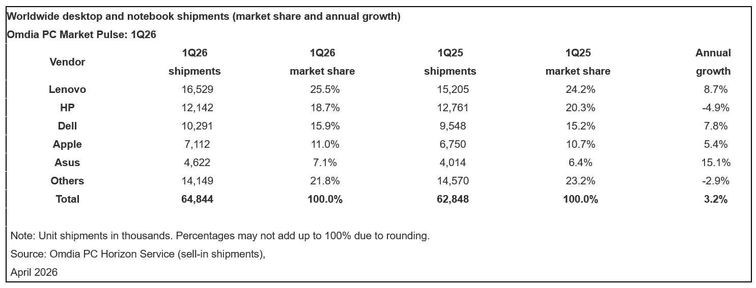 4 月 9 日消息,根據(jù) Omdia 最新數(shù)據(jù),2026 年第一季度全球臺式機、筆記本和工作站總出貨量同比增長 3.2%,達(dá)到 6480 萬臺。