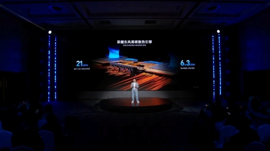 作為本次溝通會(huì)的核心產(chǎn)品,榮耀 WIN 游戲本直擊傳統(tǒng)游戲本散熱不足、噪音偏大、性能釋放受限等行業(yè)頑疾,帶來(lái)顛覆性散熱方案。該產(chǎn)品業(yè)界首發(fā) “2 離心主扇 + 4 軸流輔扇” 東風(fēng)尾噴散熱引擎,在 21mm 超薄機(jī)身內(nèi)搭建高效散熱架構(gòu),徹底打破傳統(tǒng)內(nèi)吹散熱局限。榮耀實(shí)現(xiàn)風(fēng)扇馬達(dá)小型化突破,馬達(dá)尺寸縮至 10mm,轉(zhuǎn)速穩(wěn)定超 20000RPM;同時(shí)將桌面電競(jìng)級(jí) 120×120×20mm 軸流風(fēng)扇壓縮至 21×21×7mm,配合全新散熱引擎,整機(jī)風(fēng)量較傳統(tǒng)方案提升 10%,綜合整機(jī)功耗收益達(dá) 20W。在 RTX 5070Ti 顯卡配置下,該游戲本可實(shí)現(xiàn)至高 270W 滿血功率釋放,保障大型 3A 游戲長(zhǎng)時(shí)間穩(wěn)定運(yùn)行,告別卡頓與發(fā)燙問(wèn)題。