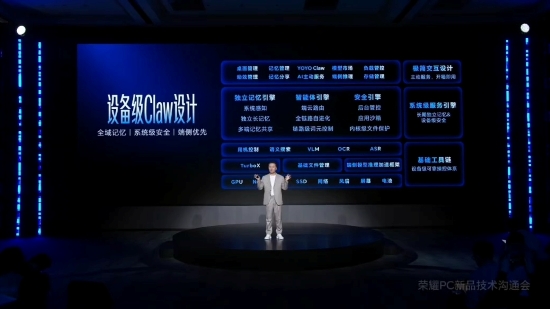 本次溝通會(huì)另一大突破,是榮耀正式推出AI PC 3.0 技術(shù),MagicBook 系列輕薄本憑借自研 YOYO Claw 技術(shù),開(kāi)創(chuàng) “養(yǎng)蝦本” 全新品類,破解 AI 智能體部署復(fù)雜、使用成本高、隱私安全風(fēng)險(xiǎn)三大痛點(diǎn)。該產(chǎn)品出廠預(yù)置 5 大主蝦、23 子蝦,覆蓋教育、辦公、學(xué)術(shù)等五大場(chǎng)景,用戶掃碼即可通過(guò)微信、飛書(shū)調(diào)用,無(wú)需復(fù)雜配置;端云協(xié)同與智能路由設(shè)計(jì),讓簡(jiǎn)單任務(wù)本地完成、復(fù)雜任務(wù)按需調(diào)用,綜合詞元消耗較 OpenClaw 方案節(jié)省 50%;獨(dú)立安全蝦實(shí)現(xiàn)設(shè)備級(jí)防護(hù),高危操作自動(dòng)攔截、敏感操作二次確認(rèn),核心數(shù)據(jù) 100% 留存本地,落實(shí)隱私安全承諾。