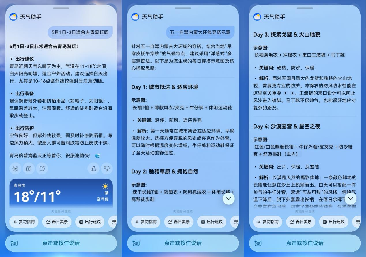 覺(jué)得看數(shù)據(jù)太麻煩,那就交給天氣助手。首頁(yè)右上角點(diǎn)放大鏡-漸變色圓圈,喚醒24小時(shí)在線的AI氣象專家。輸入“5月1日-3日適合去青島玩嗎”、“五一自駕內(nèi)蒙草原大環(huán)線五天穿什么”等問(wèn)題,它會(huì)依據(jù)實(shí)時(shí)氣象數(shù)據(jù),給出具體的出行、防曬、穿搭等建議,甚至是穿搭示意圖。跟著天氣助手準(zhǔn)備行李,在保證防曬、防風(fēng)、保暖的同時(shí)美美出片,讓每一克“負(fù)重”都值得。