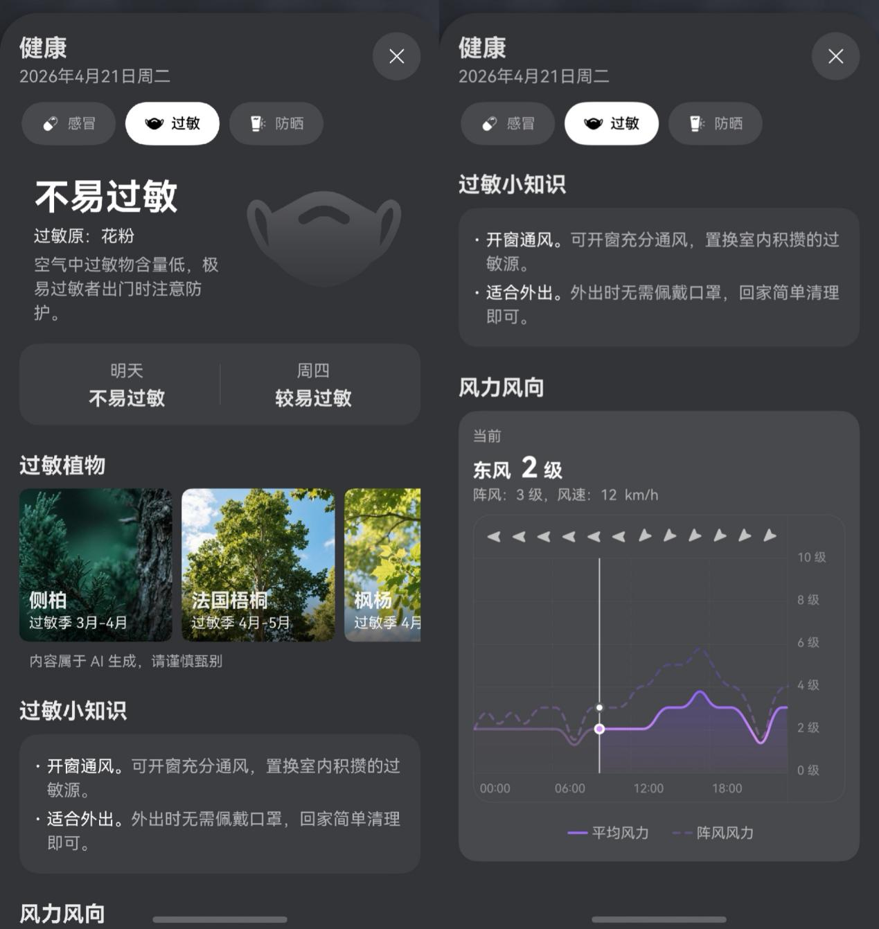 過(guò)敏星人可重點(diǎn)關(guān)注首頁(yè)過(guò)敏提醒卡,點(diǎn)開(kāi)查看當(dāng)前時(shí)段的易過(guò)敏程度評(píng)估、過(guò)敏植物、防護(hù)建議等信息,了解“敵情”提前防護(hù)準(zhǔn)備N95口罩,或直接錯(cuò)開(kāi)花粉飛絮高峰時(shí)段、遠(yuǎn)離草地花叢樹林等過(guò)敏源重災(zāi)區(qū)。