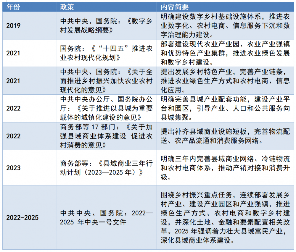 近年來,國家和地方政府持續(xù)加大對縣域經(jīng)濟發(fā)展的政策支持力度(如表1)。這些政策既涵蓋鄉(xiāng)村振興、數(shù)字鄉(xiāng)村建設、縣域商業(yè)體系建設,也涉及中小企業(yè)數(shù)字化賦能、工業(yè)互聯(lián)網(wǎng)推廣和以縣城為載體的新型城鎮(zhèn)化建設,政策方向指向明確:穩(wěn)住縣域產(chǎn)業(yè)基本盤、做好基礎(chǔ)設施補短板、推動傳統(tǒng)產(chǎn)業(yè)數(shù)字化升級、增強縣域的產(chǎn)業(yè)承載能力、推動產(chǎn)業(yè)特色化、集群化發(fā)展等。這些政策并非簡單的“扶持性投入”,而是在系統(tǒng)性降低縣域企業(yè)數(shù)字化門檻,比如基礎(chǔ)網(wǎng)絡與算力能力正加速下沉,產(chǎn)業(yè)園區(qū)、產(chǎn)業(yè)集群和特色產(chǎn)業(yè)帶成為建設重點,數(shù)據(jù)、平臺和應用開始成為政策鼓勵方向等。