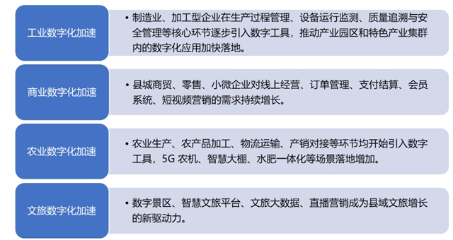 與此同時,電商、直播經(jīng)濟、冷鏈物流、品牌農(nóng)業(yè)、智慧農(nóng)業(yè)、智慧文旅等新模式在縣域快速滲透,縣域數(shù)字化需求也呈現(xiàn)出明顯的擴張和升級趨勢:從傳統(tǒng)產(chǎn)業(yè)向工業(yè)、商業(yè)、農(nóng)業(yè)、文旅等多領(lǐng)域延伸,從單點工具應用走向全鏈路集成,從提升內(nèi)部效率擴展到重構(gòu)產(chǎn)業(yè)生態(tài),從被動適應市場轉(zhuǎn)向主動數(shù)據(jù)驅(qū)動。這一進程對數(shù)字基礎(chǔ)設施、綜合解決方案和專業(yè)服務能力提出了更高、更迫切的需求。