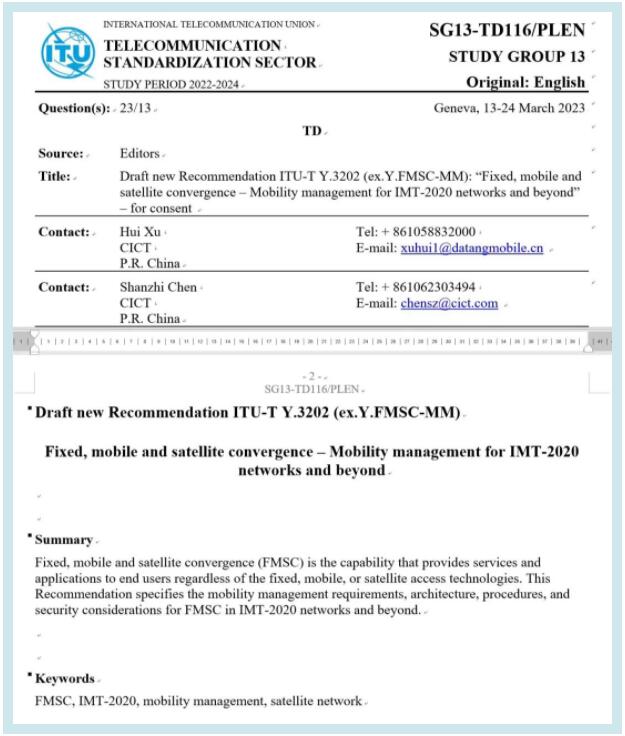 2023年3月,在剛剛結(jié)束的國際電信聯(lián)盟(ITU-T)SG13全體會議上,中國信科牽頭和主導(dǎo)制定的2項星地融合國際標(biāo)準(zhǔn):《Y.3202,F(xiàn)ixed, mobile and satellite convergence: Mobility management for IMT-2020 networks and beyond》(固定、移動和衛(wèi)星融合:面向IMT-2020及其演進網(wǎng)絡(luò)的移動性管理)、《Y.3203,F(xiàn)ixed, mobile and satellite convergence: Connection management for IMT-2020 networks and beyond》(固定、移動和衛(wèi)星融合:面向IMT-2020及其演進網(wǎng)絡(luò)的連接管理)獲批結(jié)項,實現(xiàn)了星地融合通信關(guān)鍵技術(shù)在標(biāo)準(zhǔn)化方面的突破,為星地融合通信的技術(shù)研究和標(biāo)準(zhǔn)體系構(gòu)建奠定了堅實基礎(chǔ),標(biāo)志著中國信科在星地融合“5G兼容、6G融合”取得的又一重大成果。