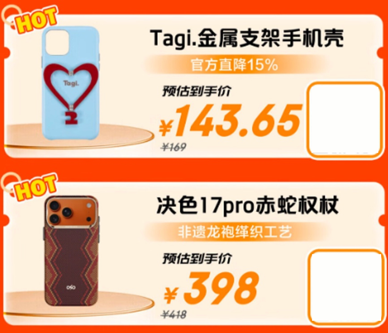 手機(jī)殼作為我們?nèi)粘1貍涞呐浼粌H能夠保護(hù)手機(jī),還能為我們的手機(jī)增添一份獨(dú)特的時(shí)尚感。Tagi讓人開心金屬支架手機(jī)殼色彩明快,搭配可自由切換的金屬愛心支架,既可手持又能支撐,中間愛心部分還能當(dāng)作鏡子使用,兼具美觀與實(shí)用,預(yù)估到手價(jià)143.65元。決色iPhone 17 Pro Max赤蛇權(quán)杖手機(jī)殼融入非遺龍袍緙織工藝,圖案栩栩如生,結(jié)合芳綸纖維與金屬材質(zhì),帶來(lái)獨(dú)特視覺與手感,預(yù)估到手價(jià)398元。