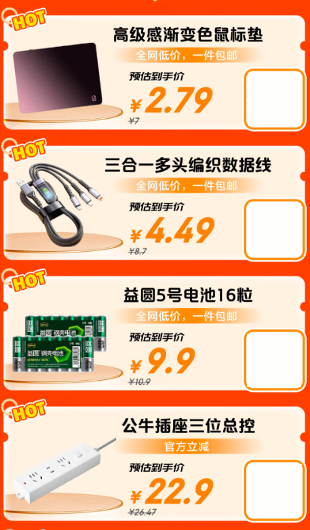 除了以上這些高品質(zhì)的配件,京東11.11還準(zhǔn)備了多款高性價(jià)比的實(shí)用配件。京喜自營(yíng)靈蛇專業(yè)電競(jìng)鼠標(biāo)墊,預(yù)估到手價(jià)僅需2.79元;三合一多頭編織數(shù)據(jù)線,支持多種設(shè)備,預(yù)估到手價(jià)4.49元,以上單品一件即包郵,現(xiàn)貨速發(fā)無(wú)需等待。益圓5號(hào)電池16粒裝,到手價(jià)低至9.9元,同樣一件包郵;公牛三位總控插座,預(yù)估到手價(jià)22.9元。各類配件覆蓋日常所需,價(jià)格親民,滿足辦公、居家、出行等多種場(chǎng)景的使用需求。