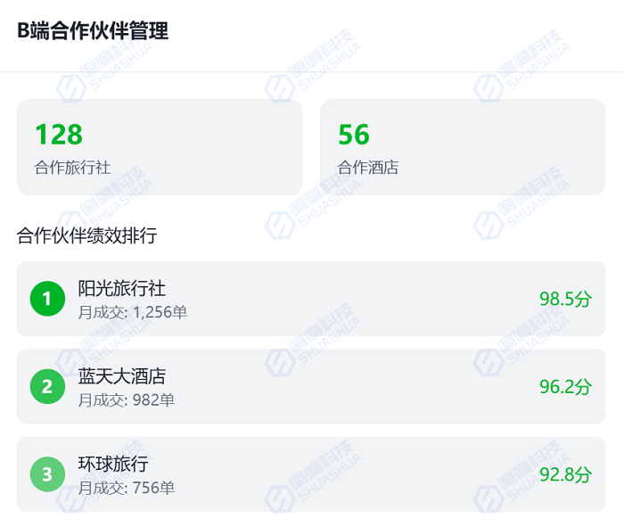 為旅行社、酒店等合作方開通主賬號+子賬號體系,支持在線查位、一鍵鎖票、自動對賬。主賬號可分配子賬號權限,并設置差異化返傭比例。系統(tǒng)生成分銷商績效看板,按帶客量、成交金額排序,并基于歷史數(shù)據(jù)推薦高潛力產(chǎn)品,助力合作方精準營銷,深化生態(tài)合作。