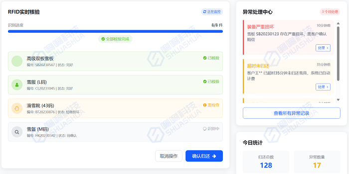 雪具歸還區(qū)部署的無源RFID識別設備,可批量讀取雪具標簽信息。系統(tǒng)自動比對租賃記錄與歸還物品,確認無誤后啟動押金退還程序,微信支付押金即時原路退回。