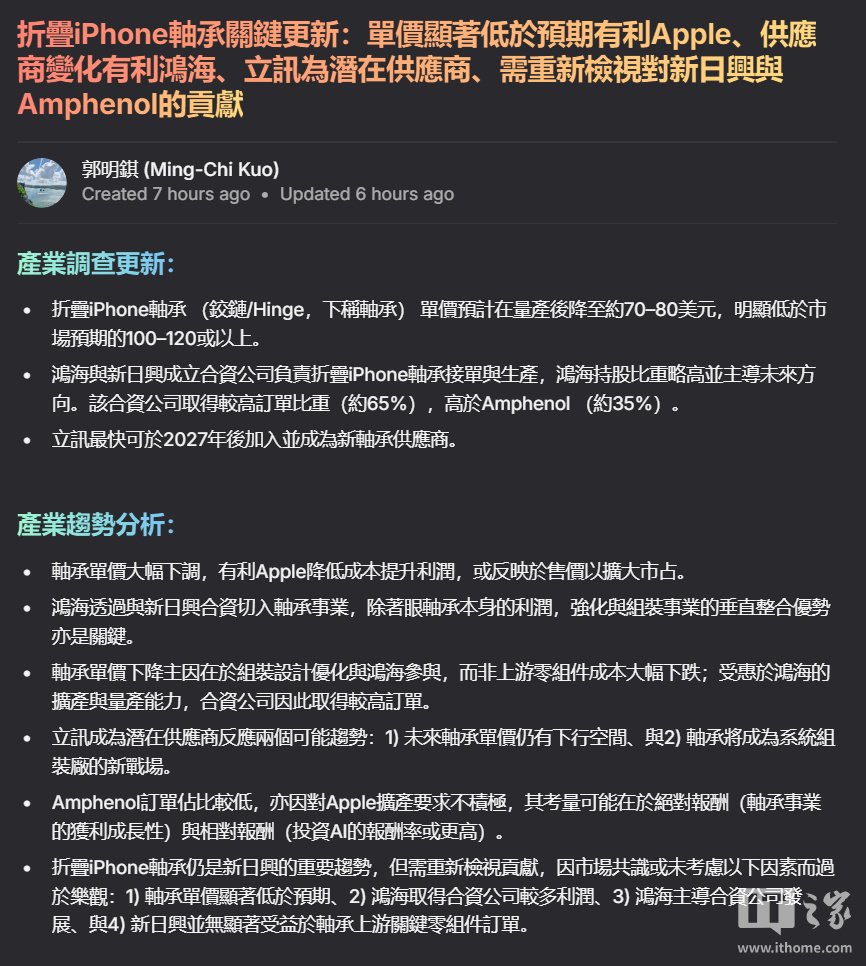 富士康與新日興已成立合資企業(yè),承擔(dān)大部分鉸鏈單元的生產(chǎn)任務(wù)。據(jù)郭明錤估計(jì),兩家合計(jì)市場(chǎng)份額約為 65%,剩余約 35% 由安費(fèi)諾(Amphenol)供應(yīng)。郭明錤還指出,立訊精密(Luxshare)最快可在 2027 年加入并成為新鉸鏈供應(yīng)商。